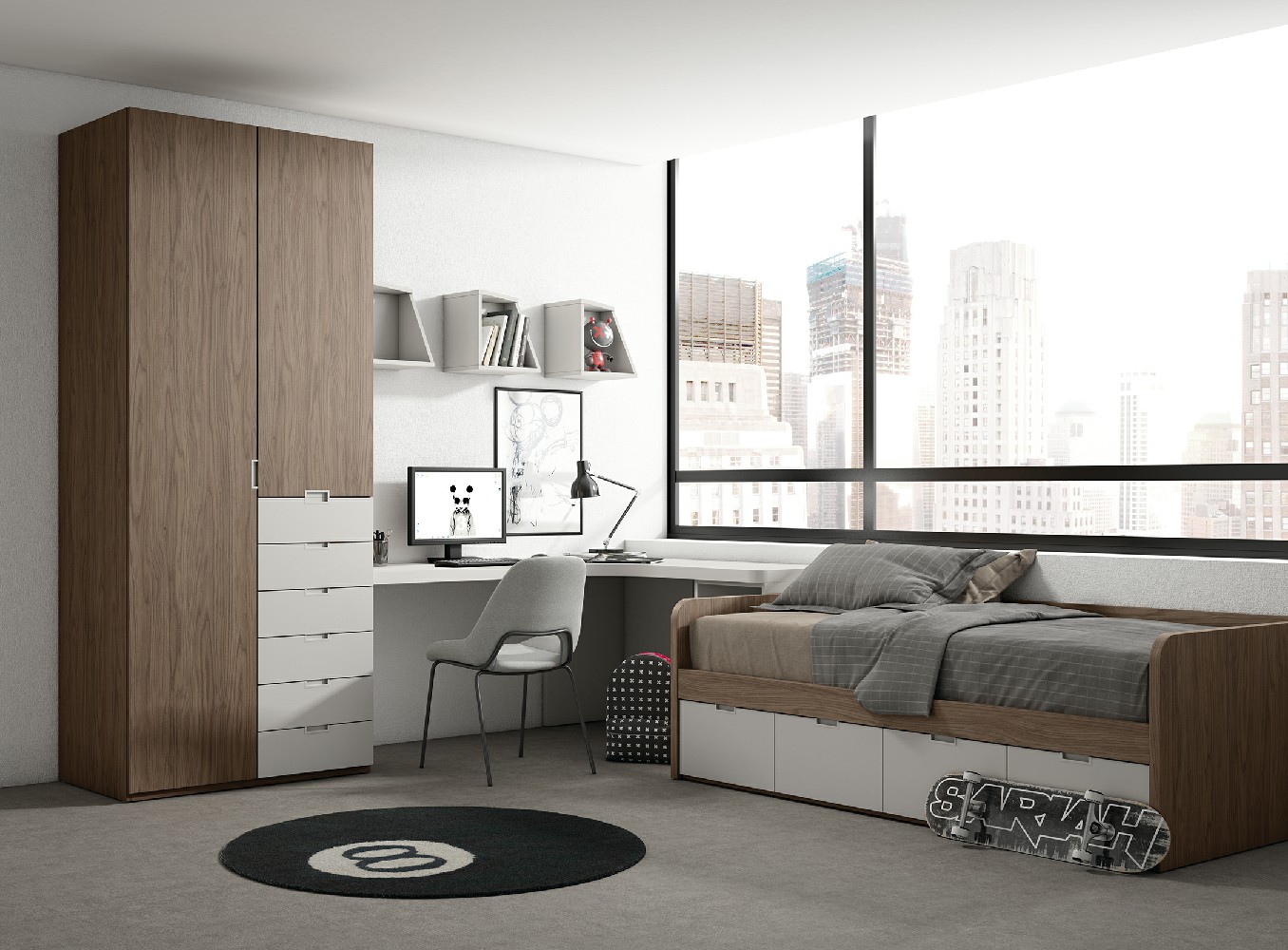 Con un diseño actual y versátil, esta propuesta combina practicidad y estilo, adaptándose fácilmente a diferentes tipos de decoración juvenil. La robustez de la estructura y la calidad de los acabados aseguran comodidad y durabilidad en el uso diario.