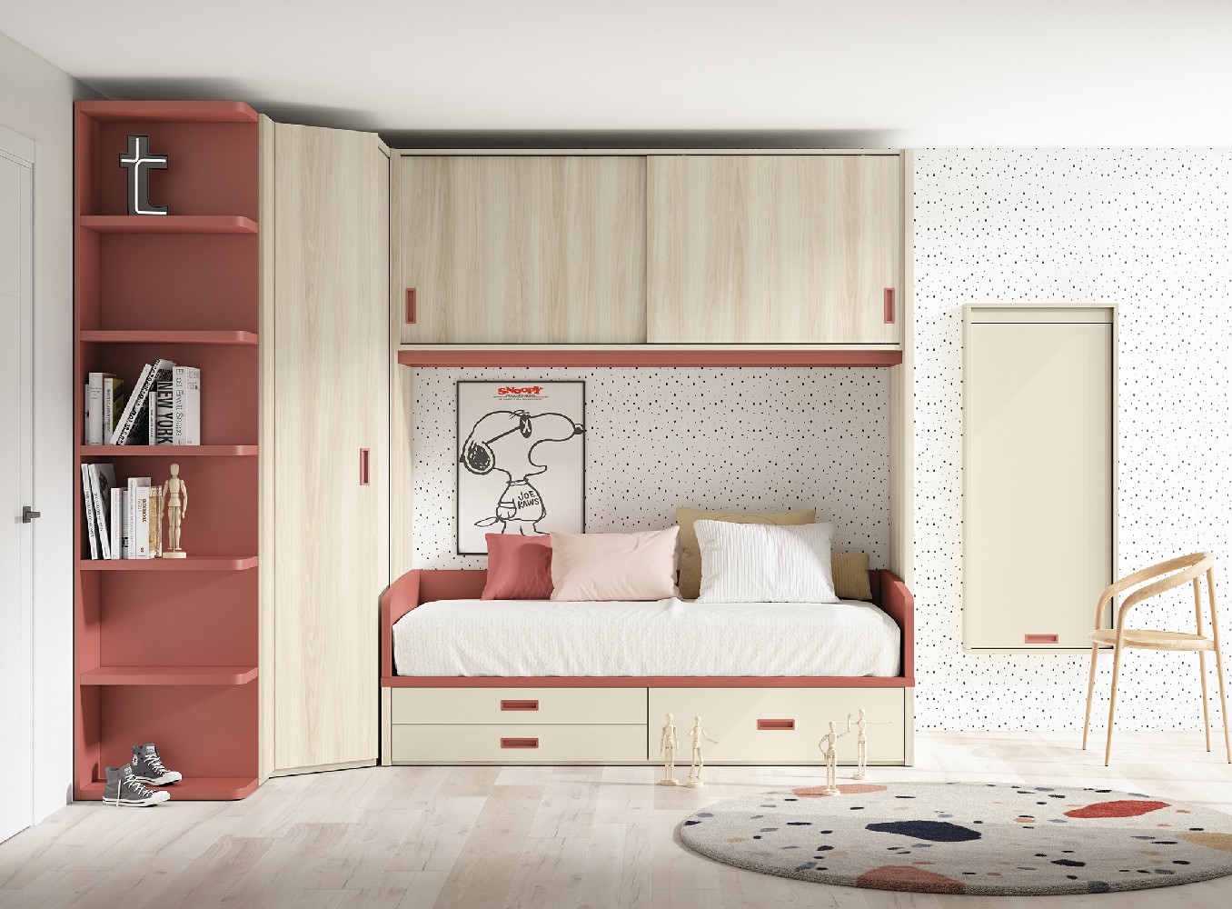 La cama nido con opciones de cajones está diseñada para transformar el dormitorio juvenil en un espacio práctico y bien organizado. Este conjunto incorpora un armario de rincón, un terminal librería, un puente con puertas correderas y una mesa de pared abatible, ofreciendo una solución completa que combina descanso, almacenaje y zona de estudio en un solo diseño. La cama nido, además, permite disponer de una segunda cama siempre lista, perfecta para invitados o hermanos que comparten habitación.