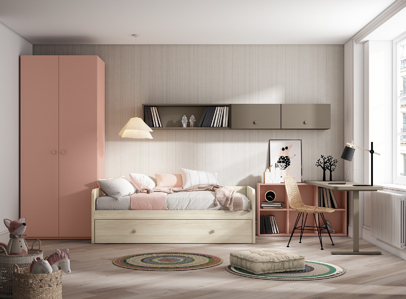 Esta composición de cama nido combina estilo, practicidad y organización para crear un dormitorio juvenil completo, cómodo y lleno de personalidad.